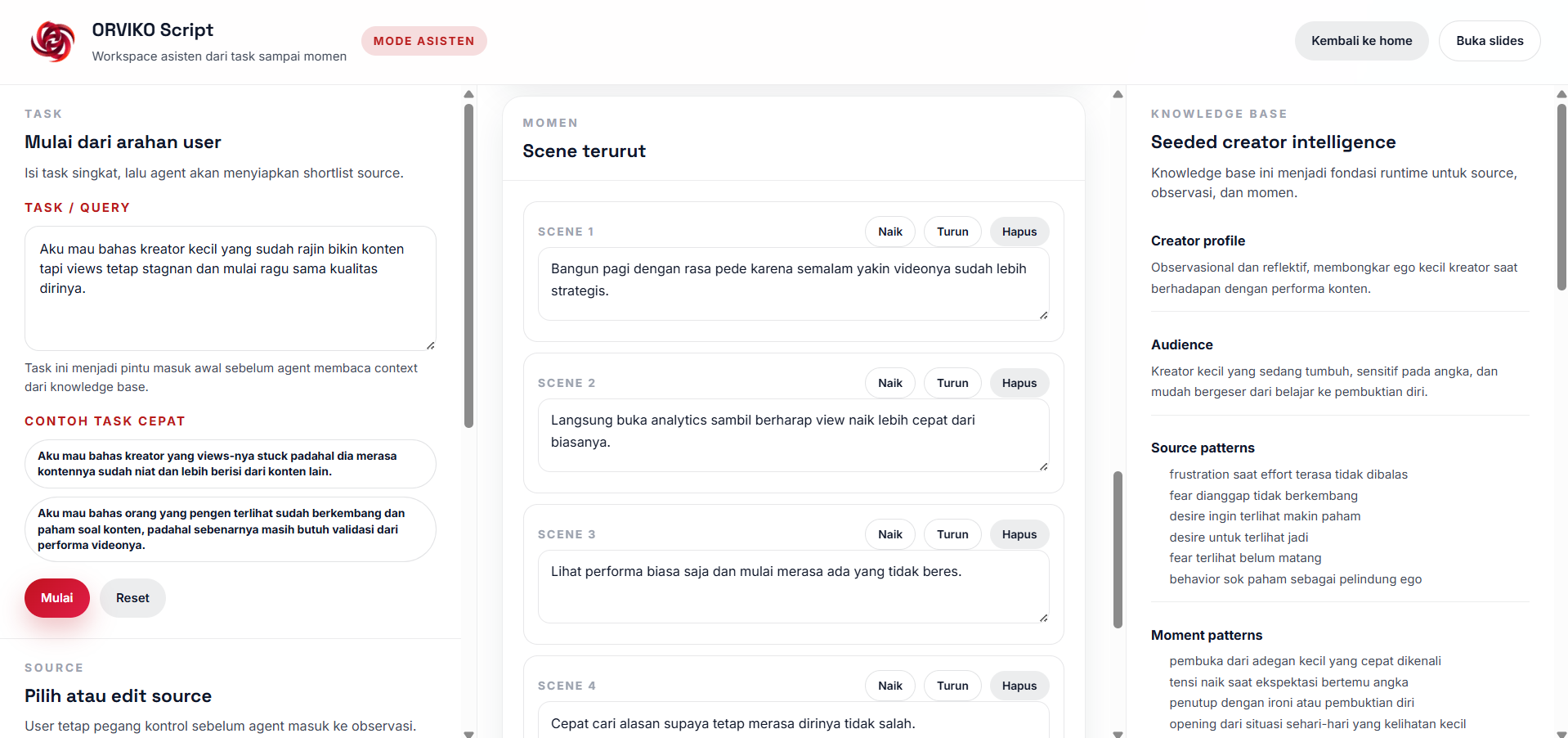 Arah utamanya adalah membantu kreator sampai ke draft script yang terasa sesuai gaya kontennya. Ide hanyalah pintu masuk, bukan output akhirnya.
